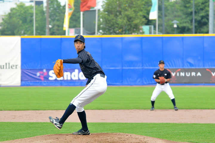 | 第1戦、8回途中まで米国打線を無失点に抑え勝利投手となった吉田侑投手(東海大) |